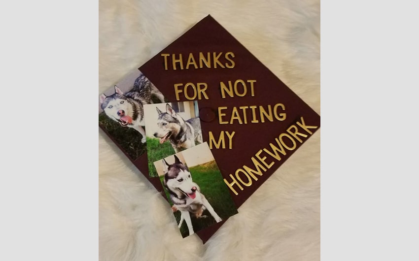 If you’re obsessed with your dog, cat, or hamster, why not let them crash your graduation day—in spirit, at least? Pet and animal joke caps are a funny and heartwarming way to honor your furry (or scaly) best friend. Think phrases like “Paws-itively Graduated” with a paw print design or “I did it for the cat” next to a cute photo of your pet.